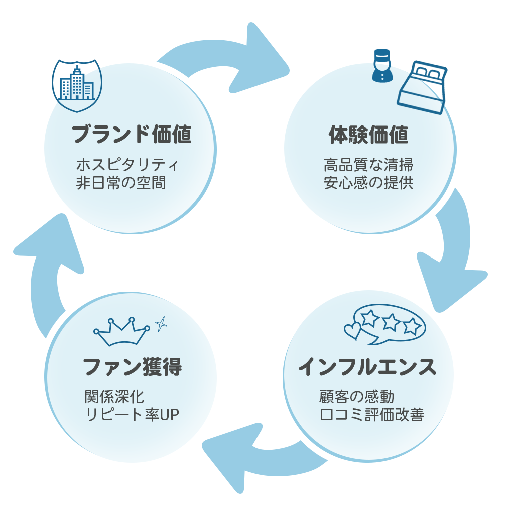 高品質な客室、清掃の行き届いたロビー、笑顔で挨拶をするスタッフ。いずれかが欠けるだけで、ゲストの体験価値はおおきくかわってきます。清潔を維持することで可能になる、不動産としての価値も忘れてはならないポイントです。